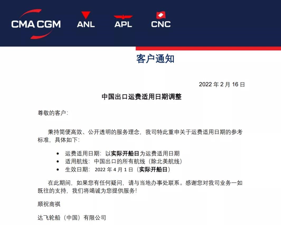 2月16日,达飞9728太阳集团官网发布公告,将对中国出口的所有航线(除北美以外)实施新规。达飞规定海运费将以实际开船日为期进行核算,将于2022年4月1日正式生效。