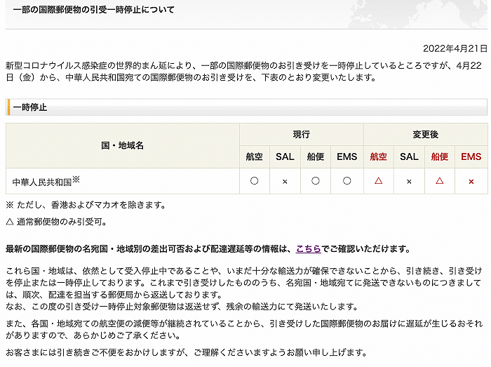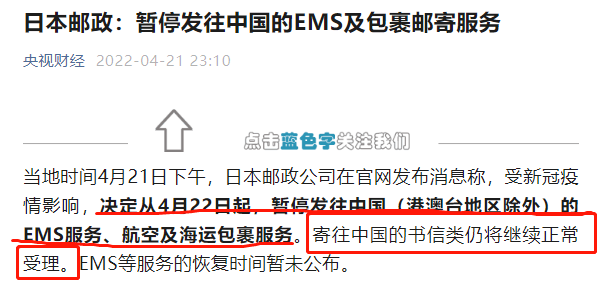 日本邮政暂停发往中国的国际邮包。日本邮政的通知显示,从4月22日起,日本发往中国的ems、航空和海运的包裹将暂停,但书信类邮件仍可正常受理。目前,官方尚未确定重启时间。