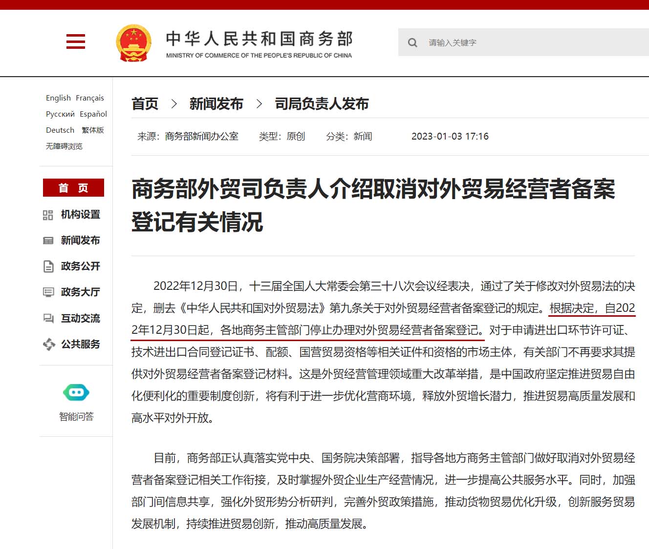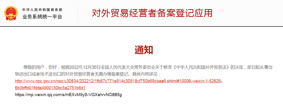 根据决定,自2022年12月30日起,各地商务主管部门停止办理对外贸易经营者备案登记。对于申请进出口环节许可证、技术进出口合同登记证书、配额、国营贸易资格等相关证件和资格的市场主体,有关部门不再要求其提供对外贸易经营者备案登记材料。