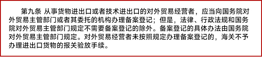 此前对外贸易法第九条规定,从事货物进出口或者技术进出口的对外贸易经营者,应当向国务院对外贸易主管部门或者其委托的机构办理备案登记;但是,法律、行政法规和国务院对外贸易主管部门规定不需要备案登记的除外。备案登记的具体办法由国务院对外贸易主管部门规定。对外贸易经营者未按照规定办理备案登记的,海关不予办理进出口货物的报关验放手续。