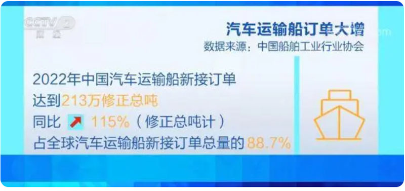 据cctv2报道,受益于汽车出口量大增,汽车运输船成为我国船舶企业的一大订单来源,2022年,我国汽车运输船新接订单总量占到全球的88.7%,订单排到2026年!