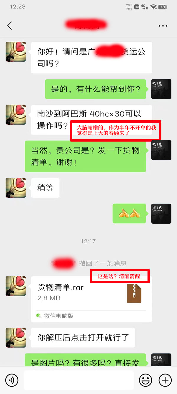 看来货代人也被黑客木马盯上了,一般情况下这些都是木马病毒,他们利用这些病毒可以直接控制载体电脑、手机等等,从而获取相关的账号密码、客户信息、以及通讯软件的相关资料,造成的损失不可谓不大!