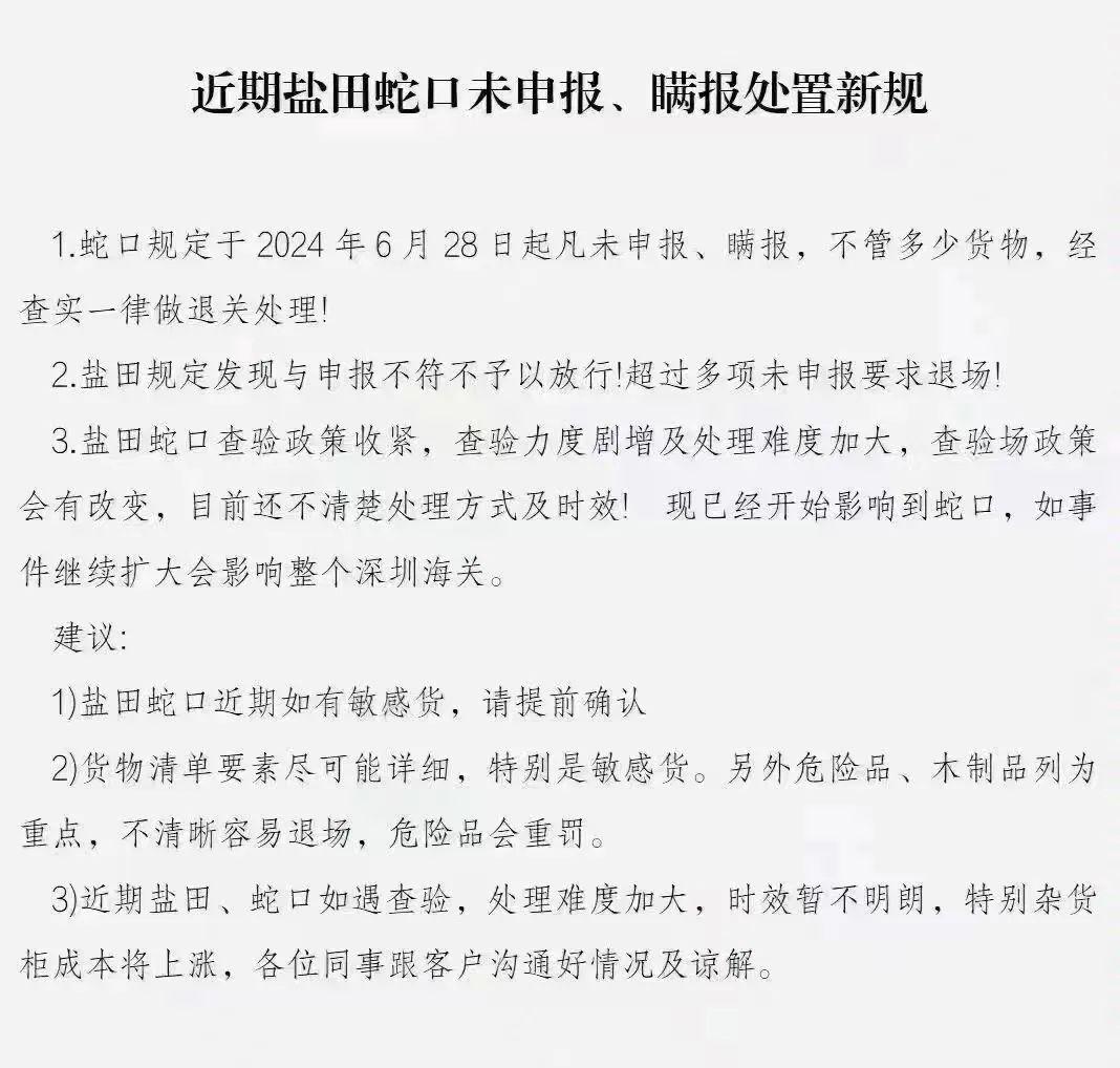 1.蛇口规定于2024年6月28日起凡未申报、瞒报,不管多少货物,经查实一律做退关处理!