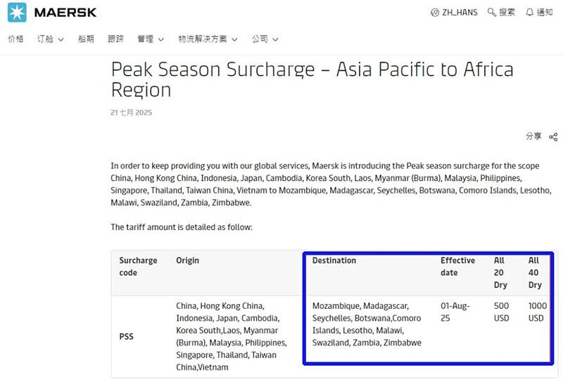 近日,马士基发布8月运价调整计划,自2025年8月1日起,征收亚太至非洲地区的旺季附加费(pss) 。