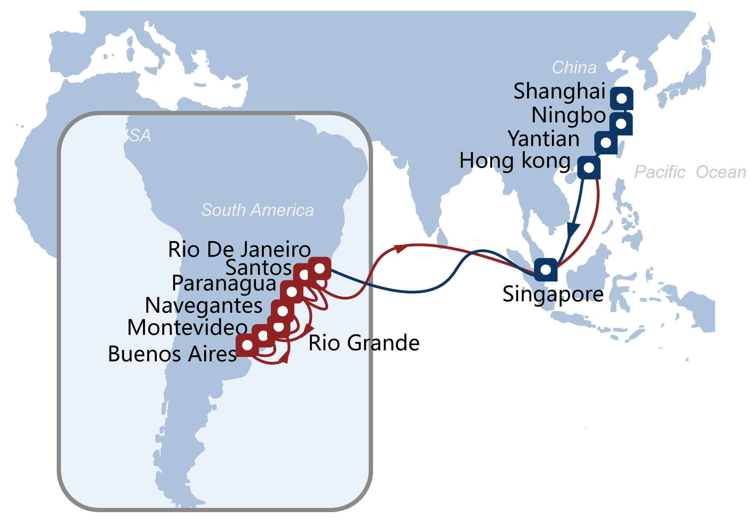 vitoria经santos中转, salvador经santos embra port中转,rosario和asuncion经montevideo中转。