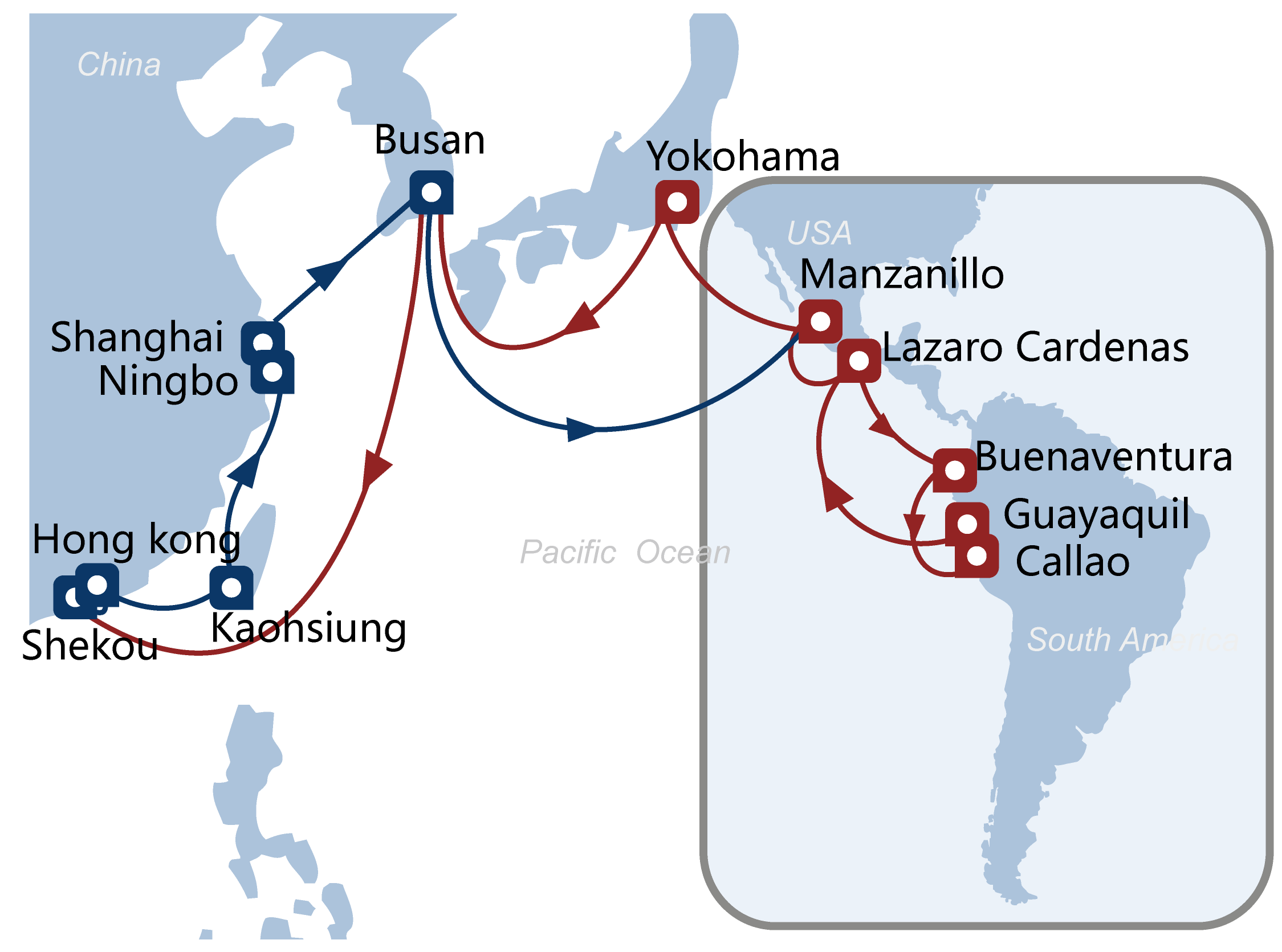 以manzanillo(mexico),manzanillo(panama),kingston和caucedo作为中转港,覆盖更多中美洲及加勒比偏港服务